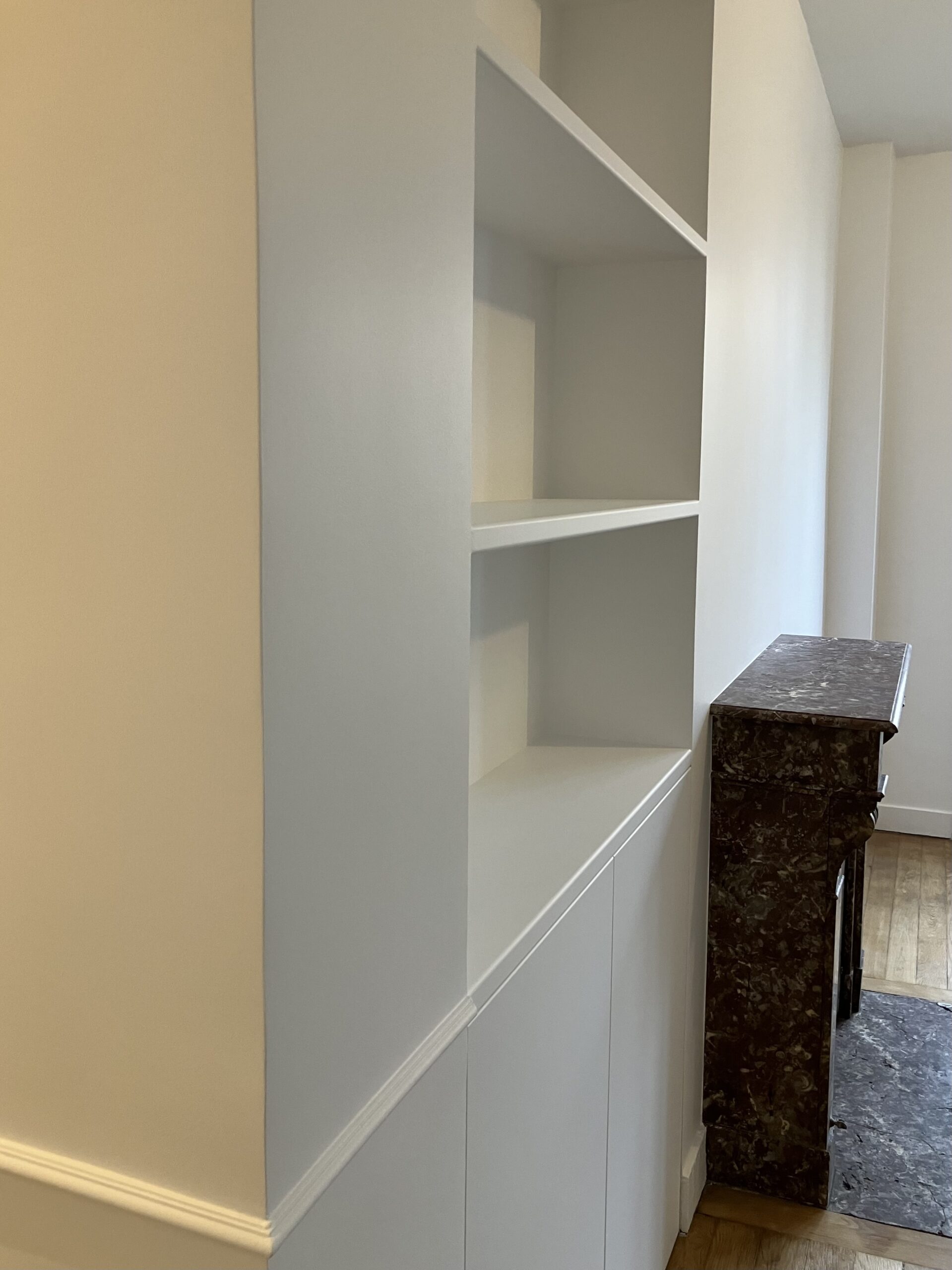 L’ensemble des étagères et du mobilier réalisé à reçu une couche d’impression puis 2 couches de finition afin que l’ensemble soit parfaitement homogène et intégré.