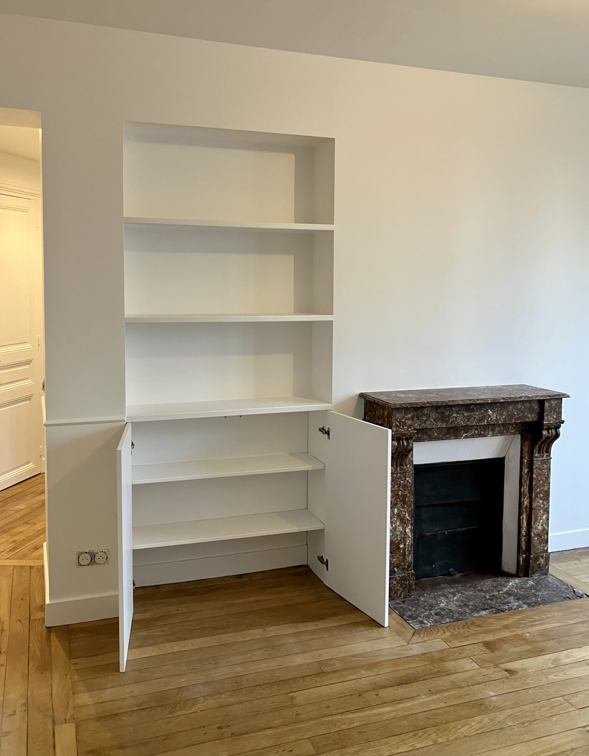 Le souhait était d’agencer la niche présente sur le mur et d’y inclure des rangements fermés et ouverts afin de pouvoir mettre en valeur des objets.