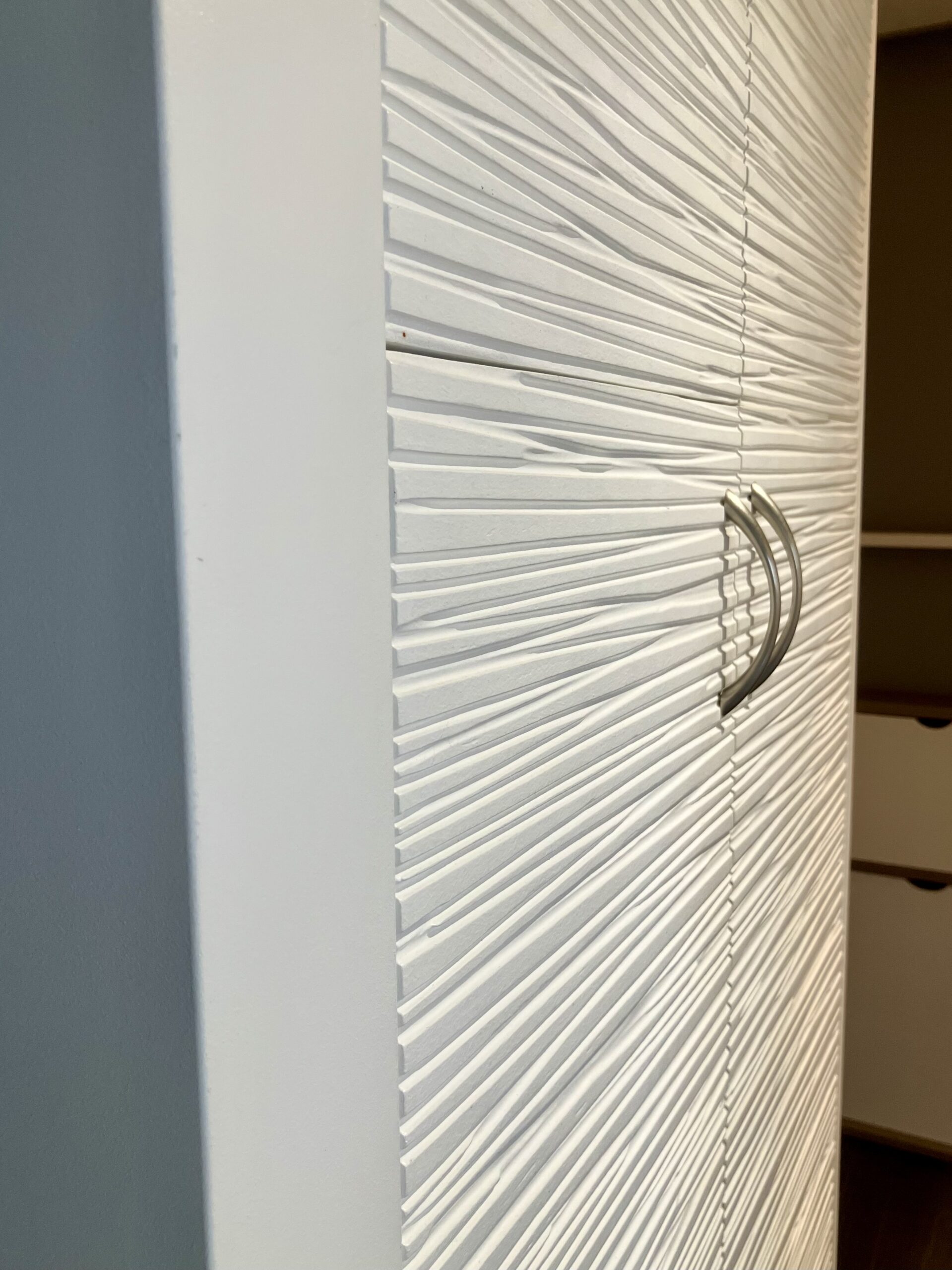 Dans la chambre équipée d’un lit escamotable, un dressing composé de portes sculptées a été crée à l’entrée avec une zone de stockage ouverte sur le dessus afin d’en faciliter l’accès.