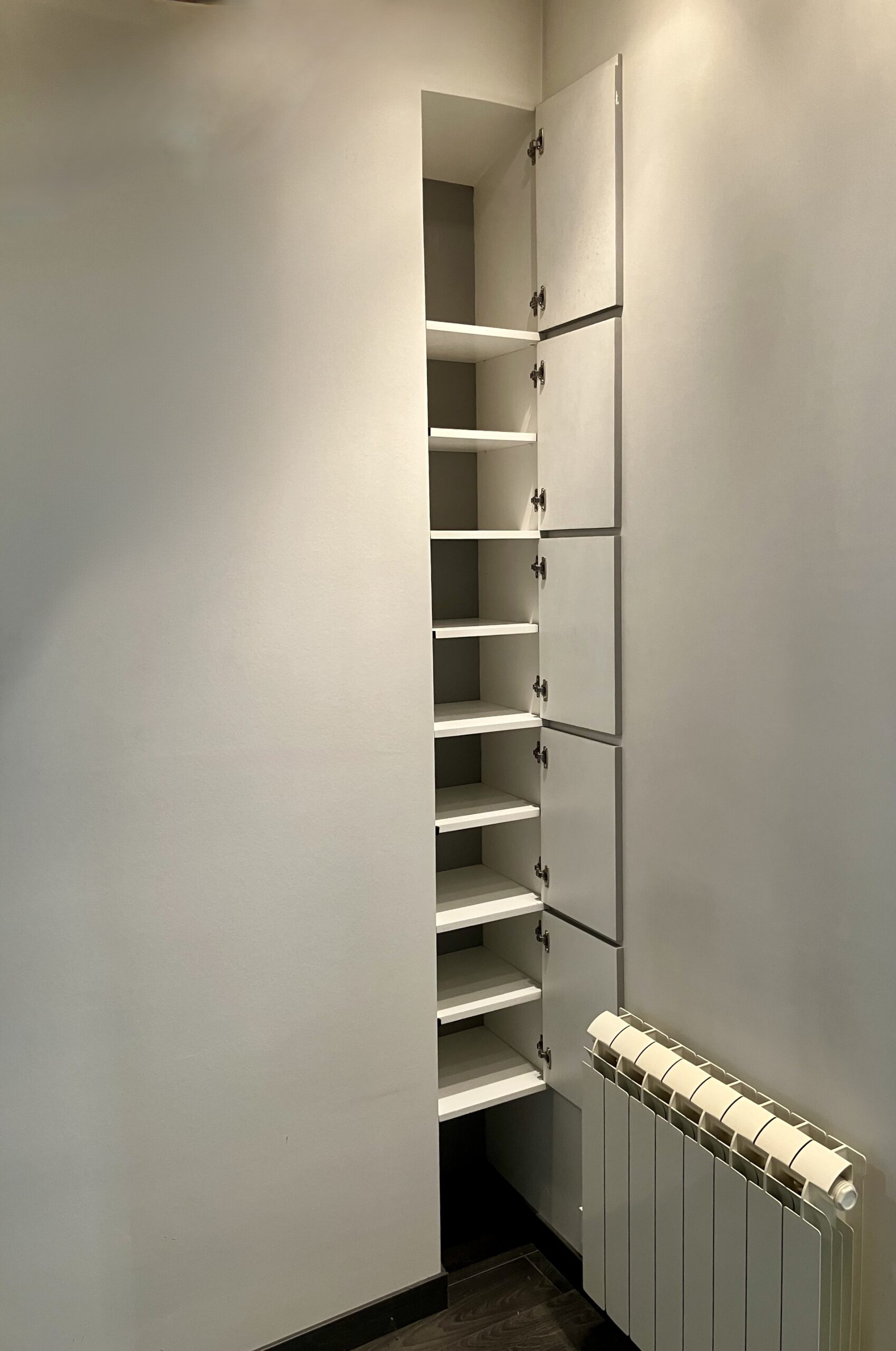 Le souhait dans ce petit appartement était d’y créer un maximum de rangements, de les intégrer en exploitant l’architecture atypique en tirant partis des recoins exigus afin de minimiser l’emprise au sol.