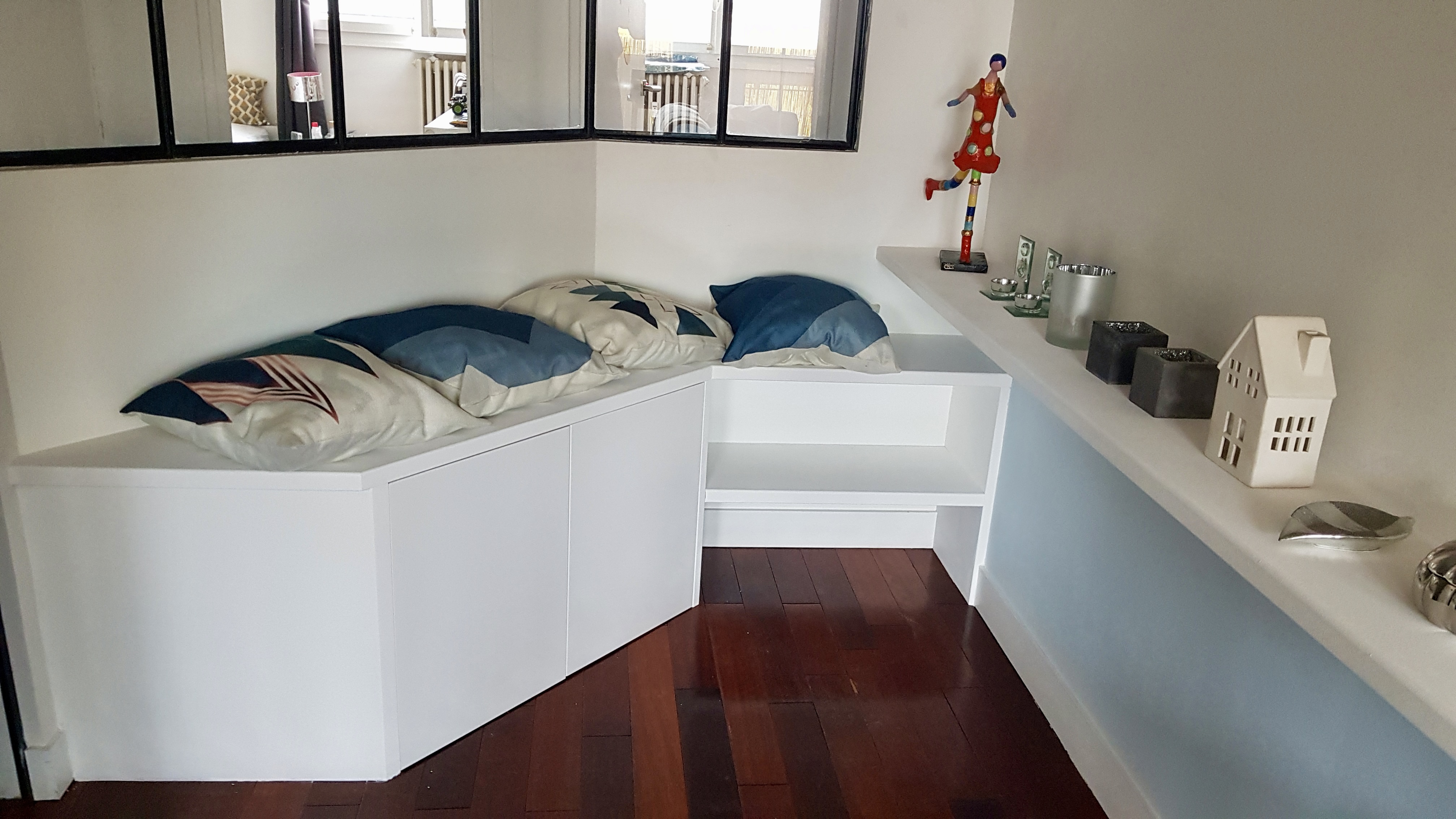 Une banquette et des étagères ont été réalisées sur mesure afin de pouvoir s’y intégrer avec justesse.
