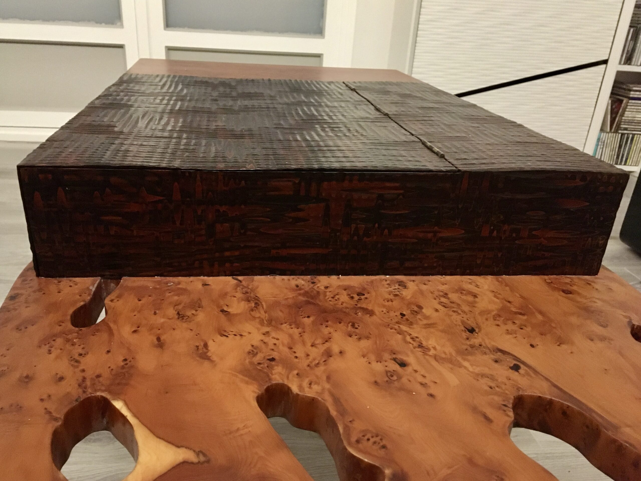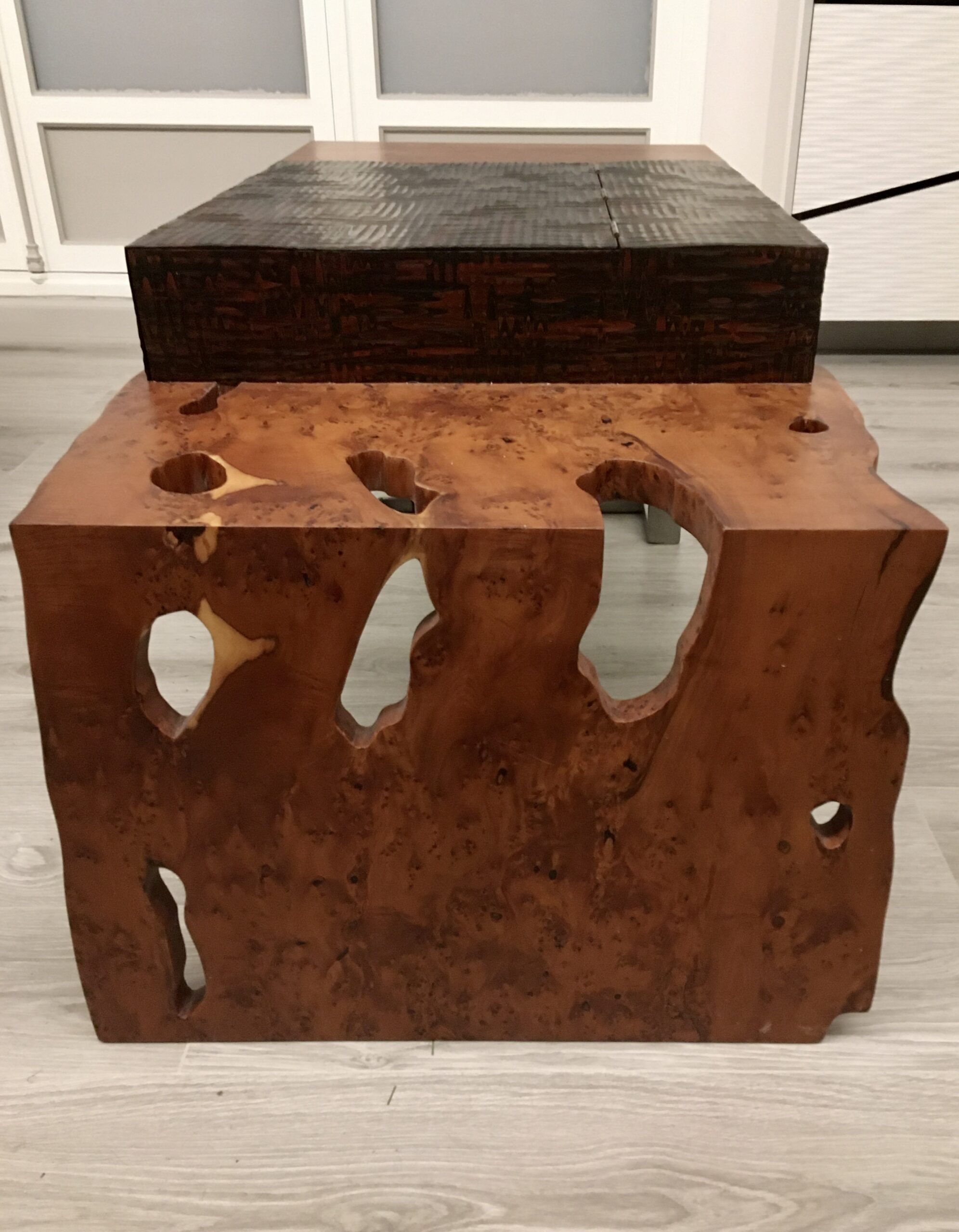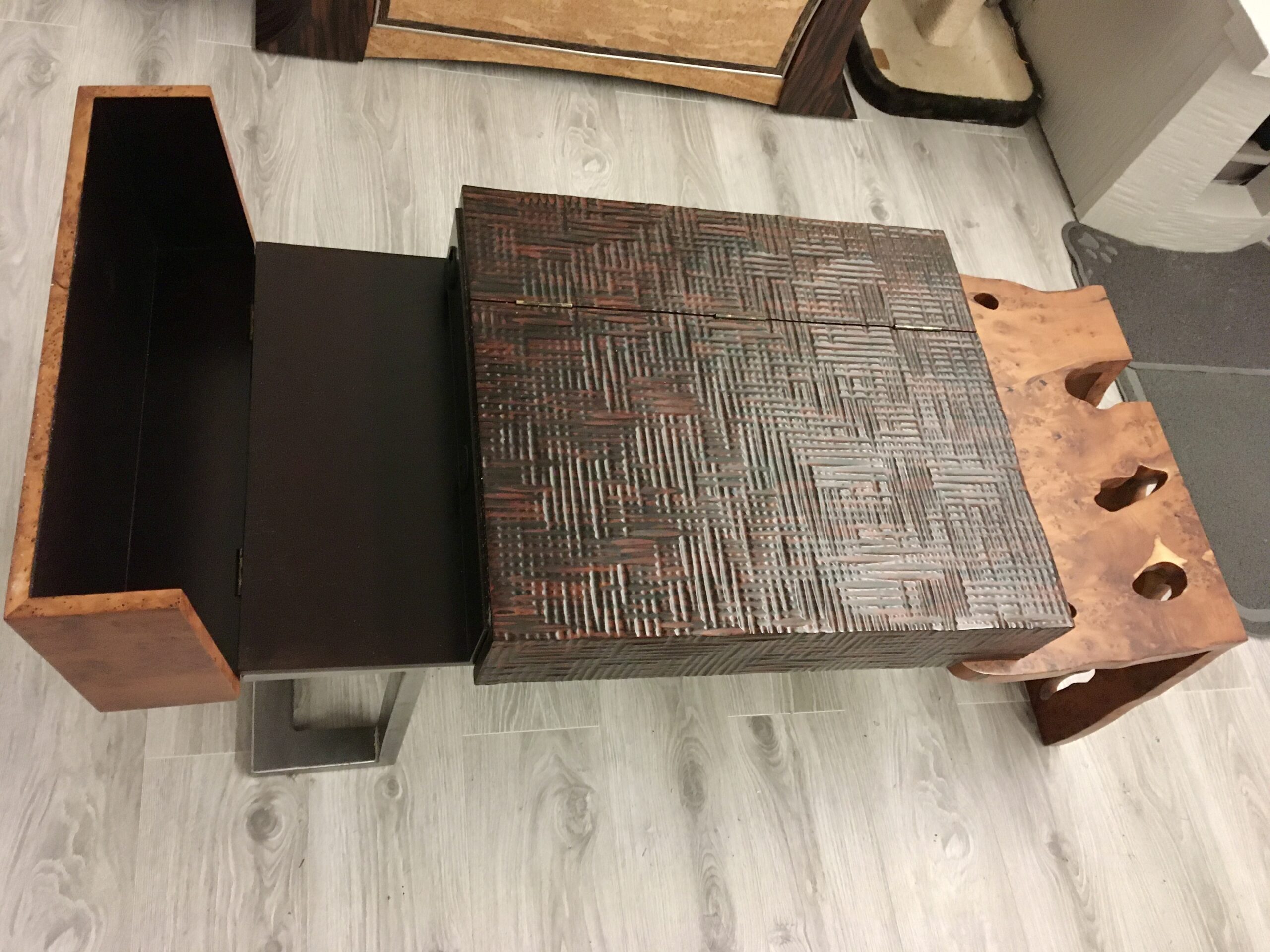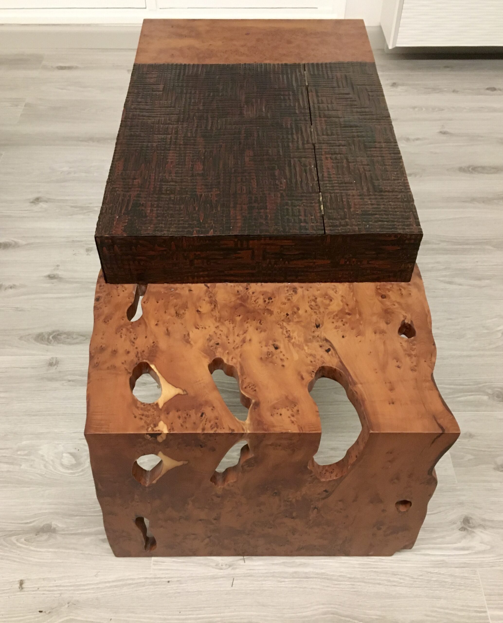 Le piétement et une partie du plateau ont étés décorés avec de la loupe d’if.