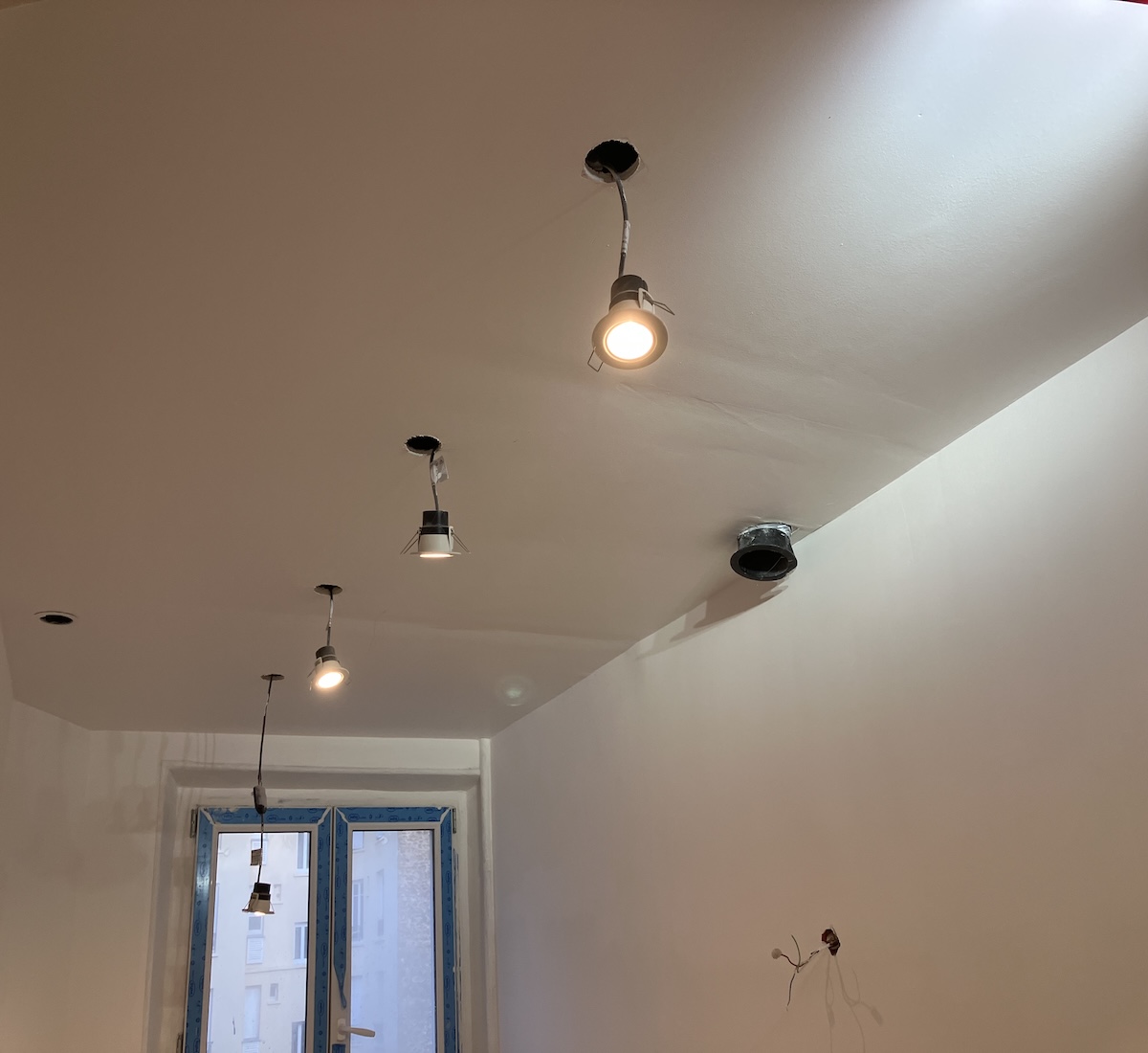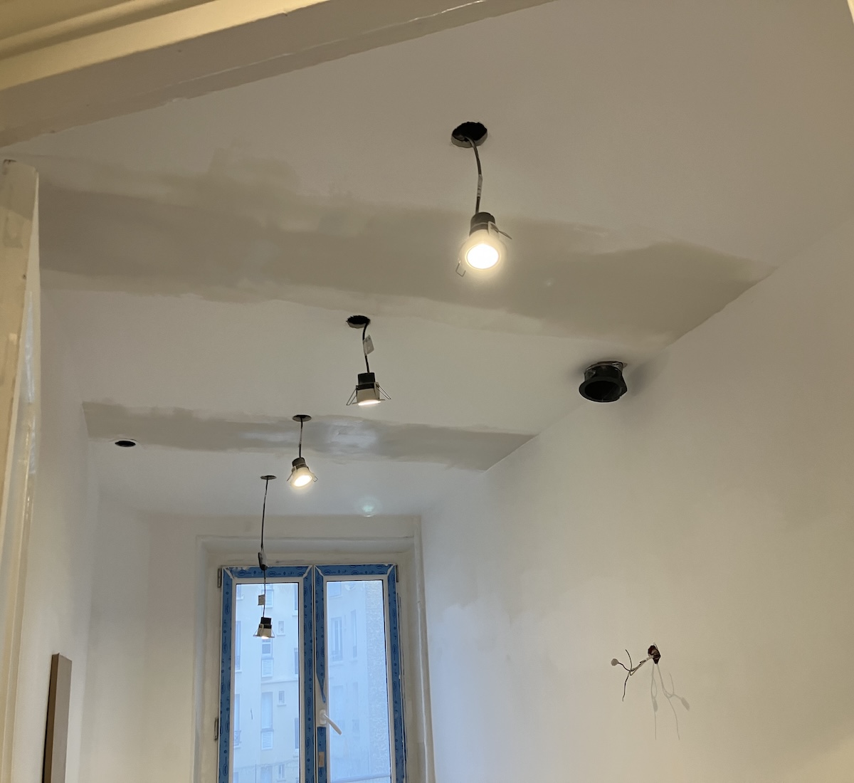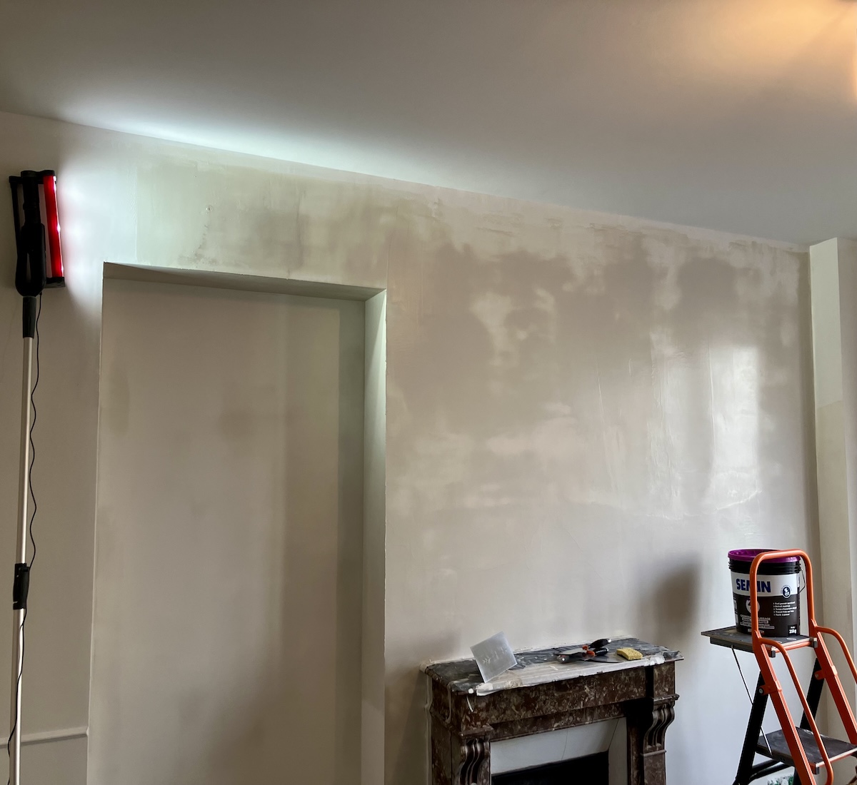 Ratissage total des murs & plafond, application d’une impression solvanté puis mise en peinture de l’ensemble avec 2 couches de finition de laque glycéro.