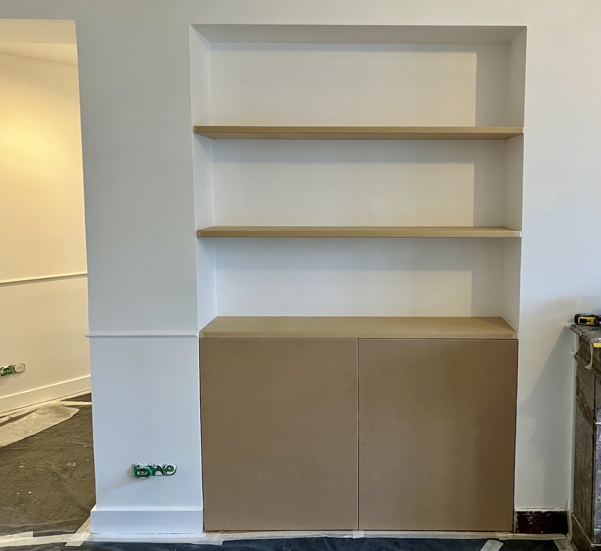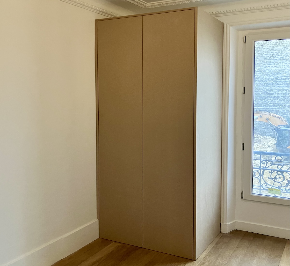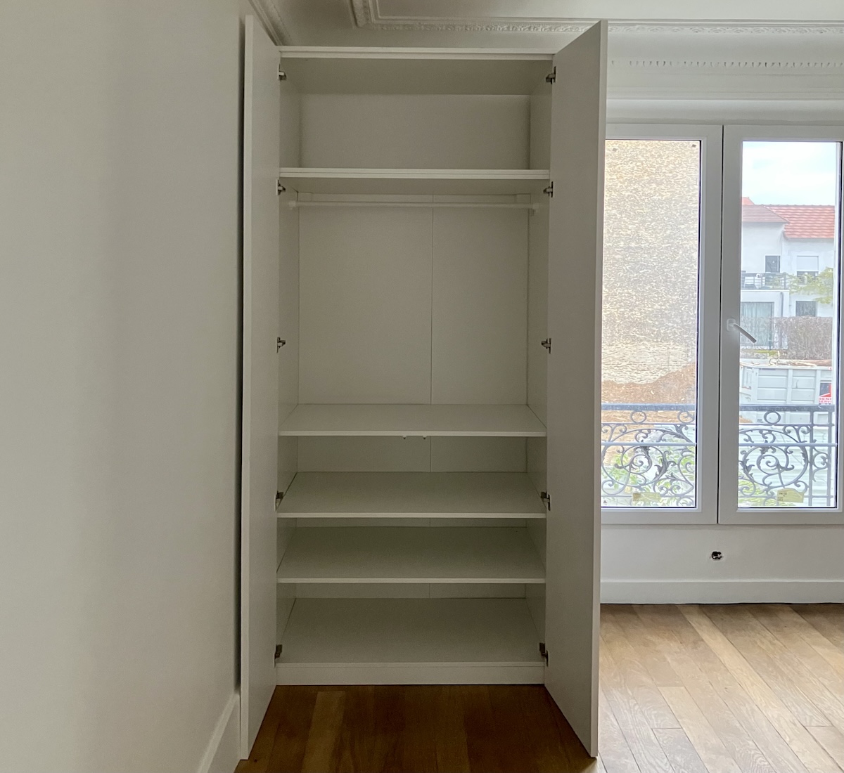 Conception, réalisations sur mesure et mise en peinture: d’un dressing, d’étagères à fixations invisibles et d’un meuble de rangement décoratif en mdf de 30 mm.