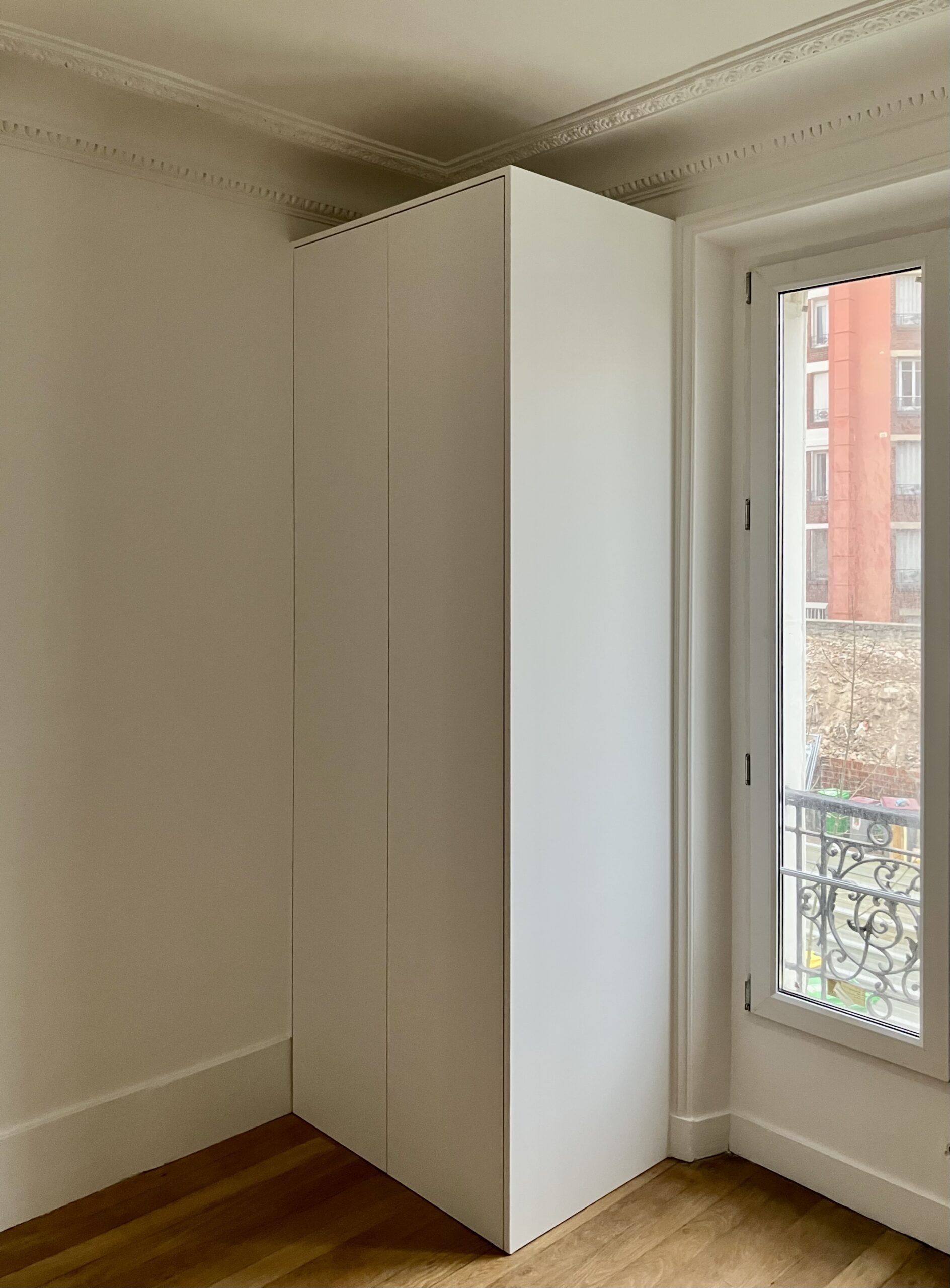 Conception, réalisations sur mesure et mise en peinture: d’un dressing, d’étagères à fixations invisibles et d’un meuble de rangement décoratif en mdf de 30 mm.