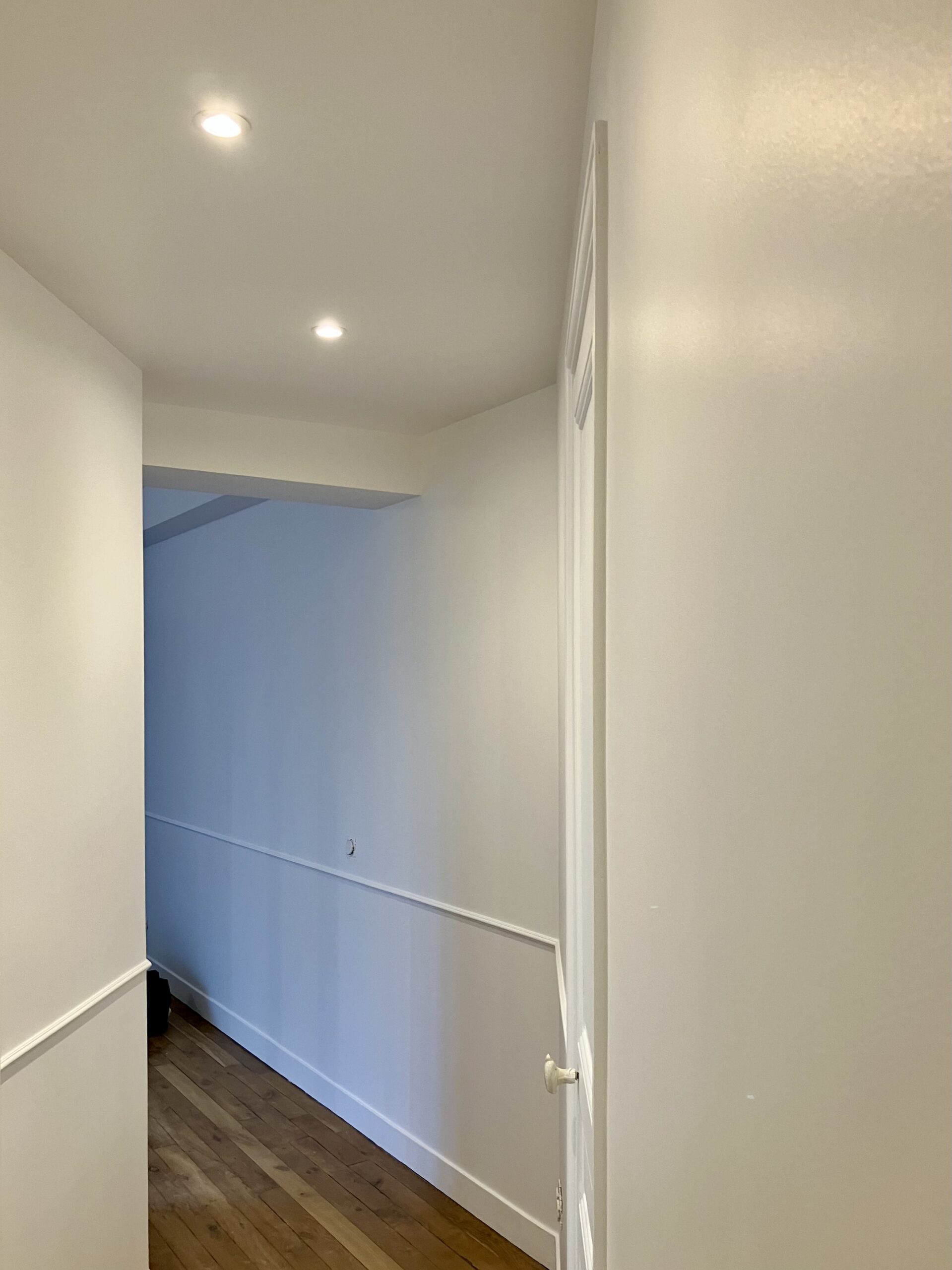 Ratissage total des murs & plafond, application d’une impression solvanté puis mise en peinture de l’ensemble avec 2 couches de finition de laque glycéro.