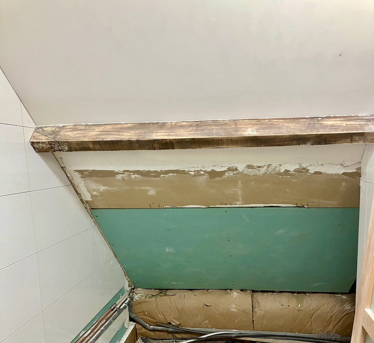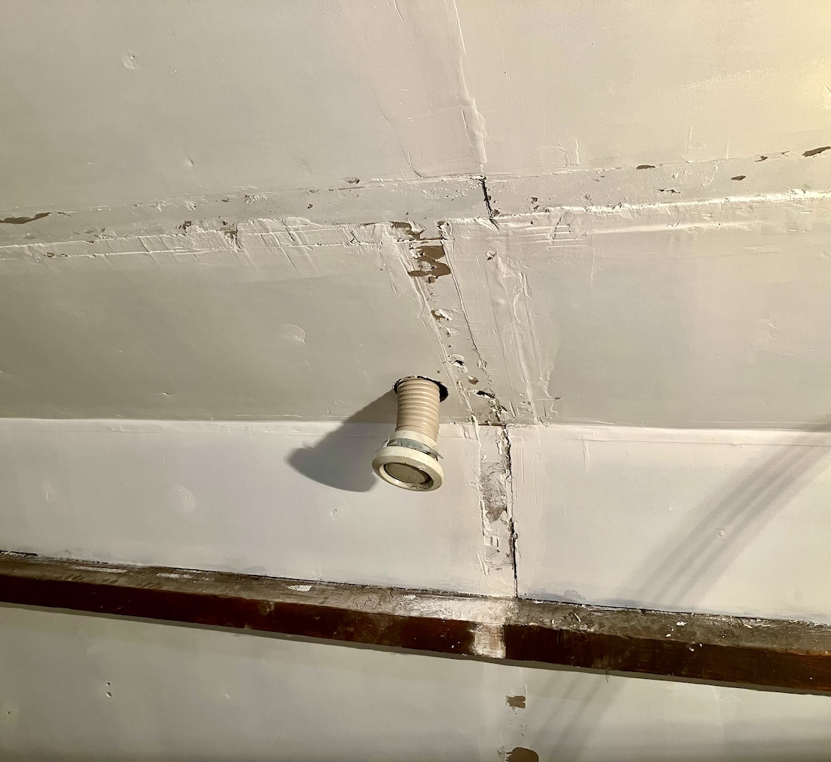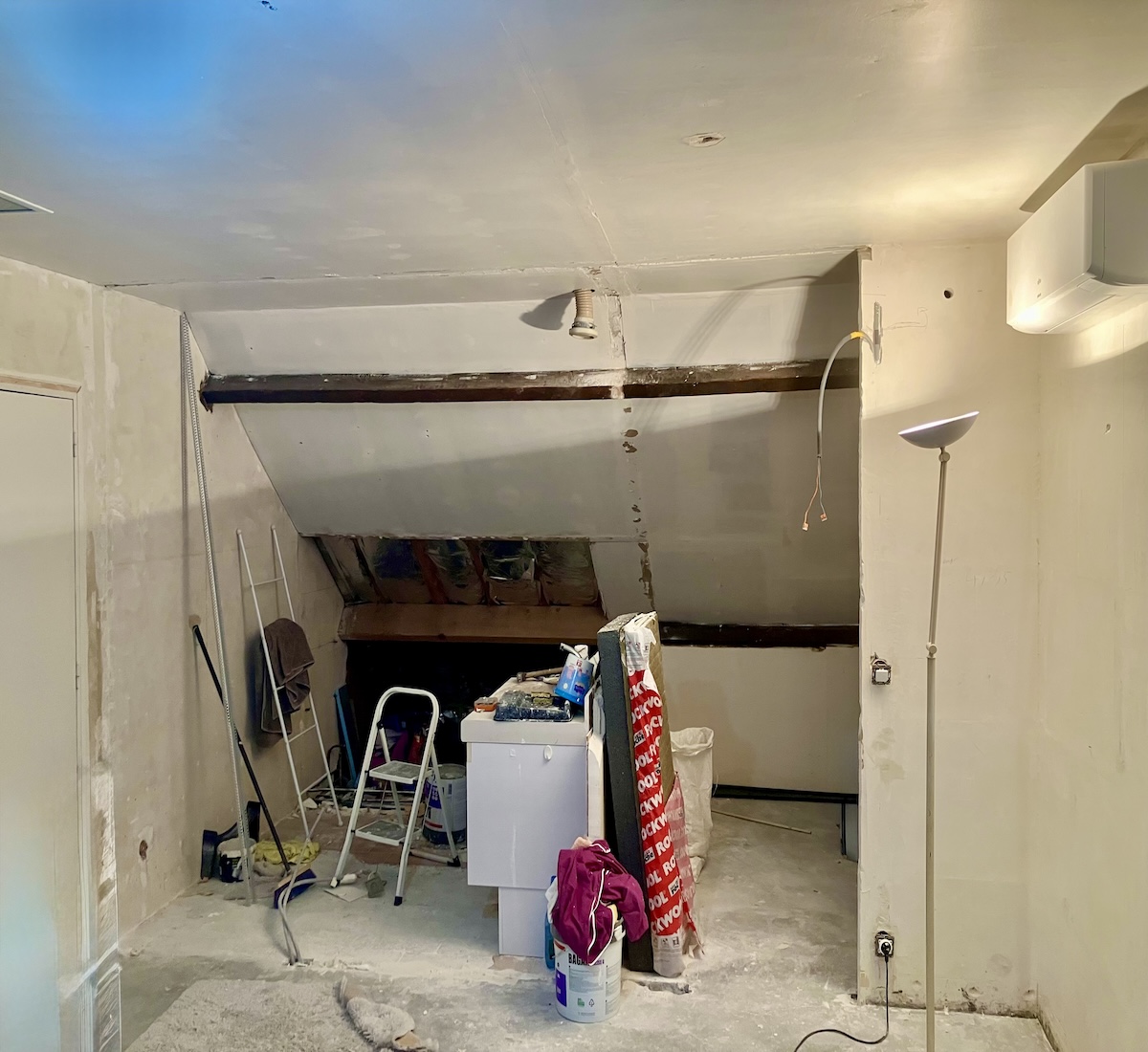 Pose de bandes armées sur l’ensemble des fissures, mise en place de cornières d’angle métallique, ratissage total des murs et du plafond puis ponçage / dépoussiérage avant finition.