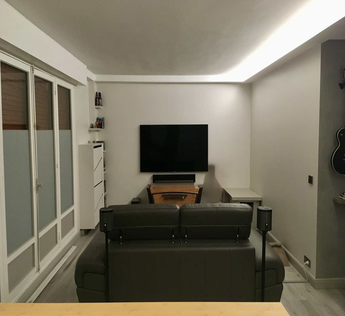 Un faux plafond technique et des corniches ont étés réalisés permettant d’éclairer l’ensemble des pièces séparément et de manière variable.