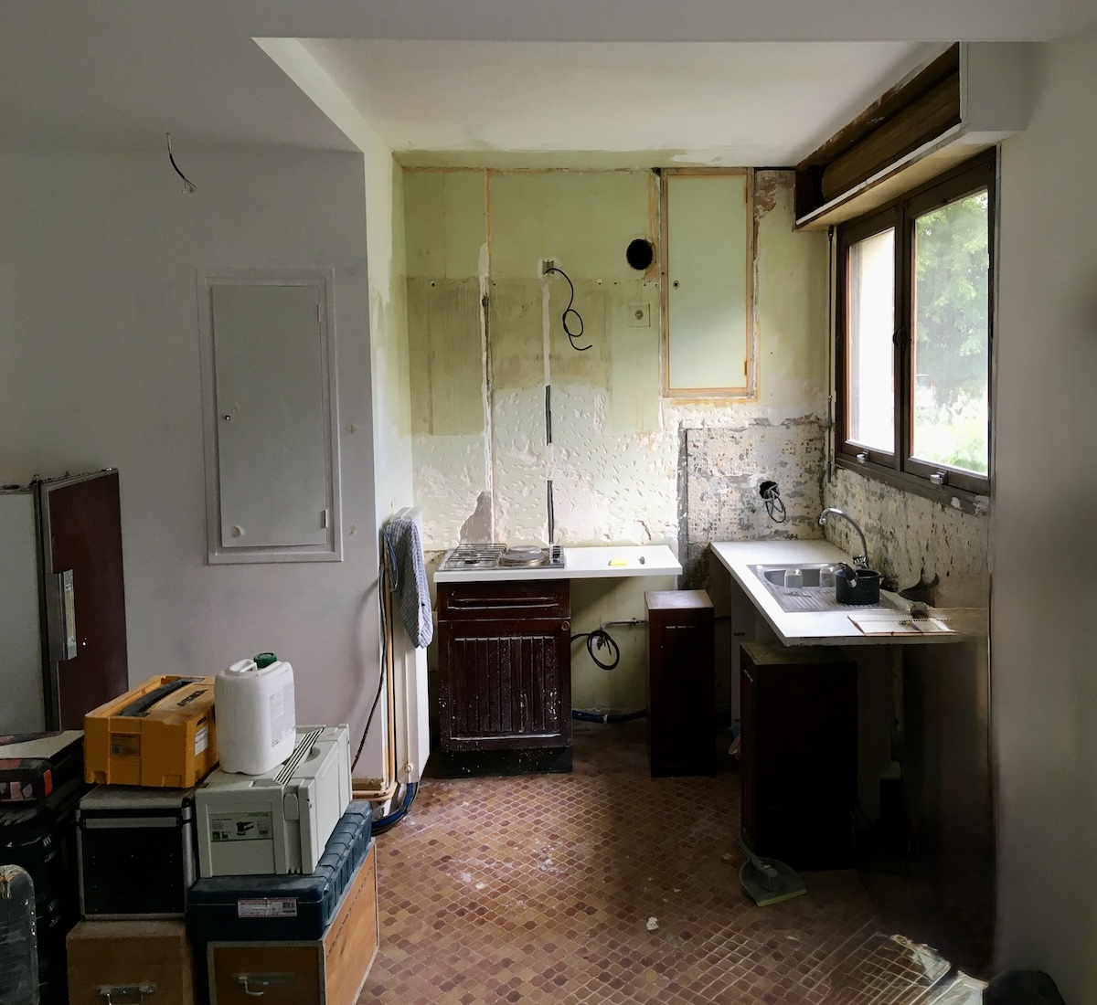 Préparation de l’ensemble des supports et boiseries, ratissages total des murs et plafonds avant la mise en peinture de l’ensemble.