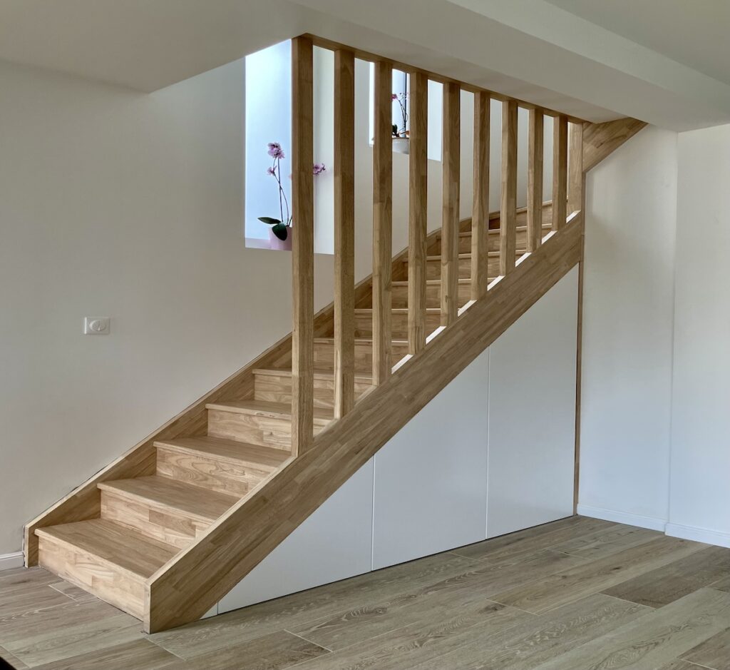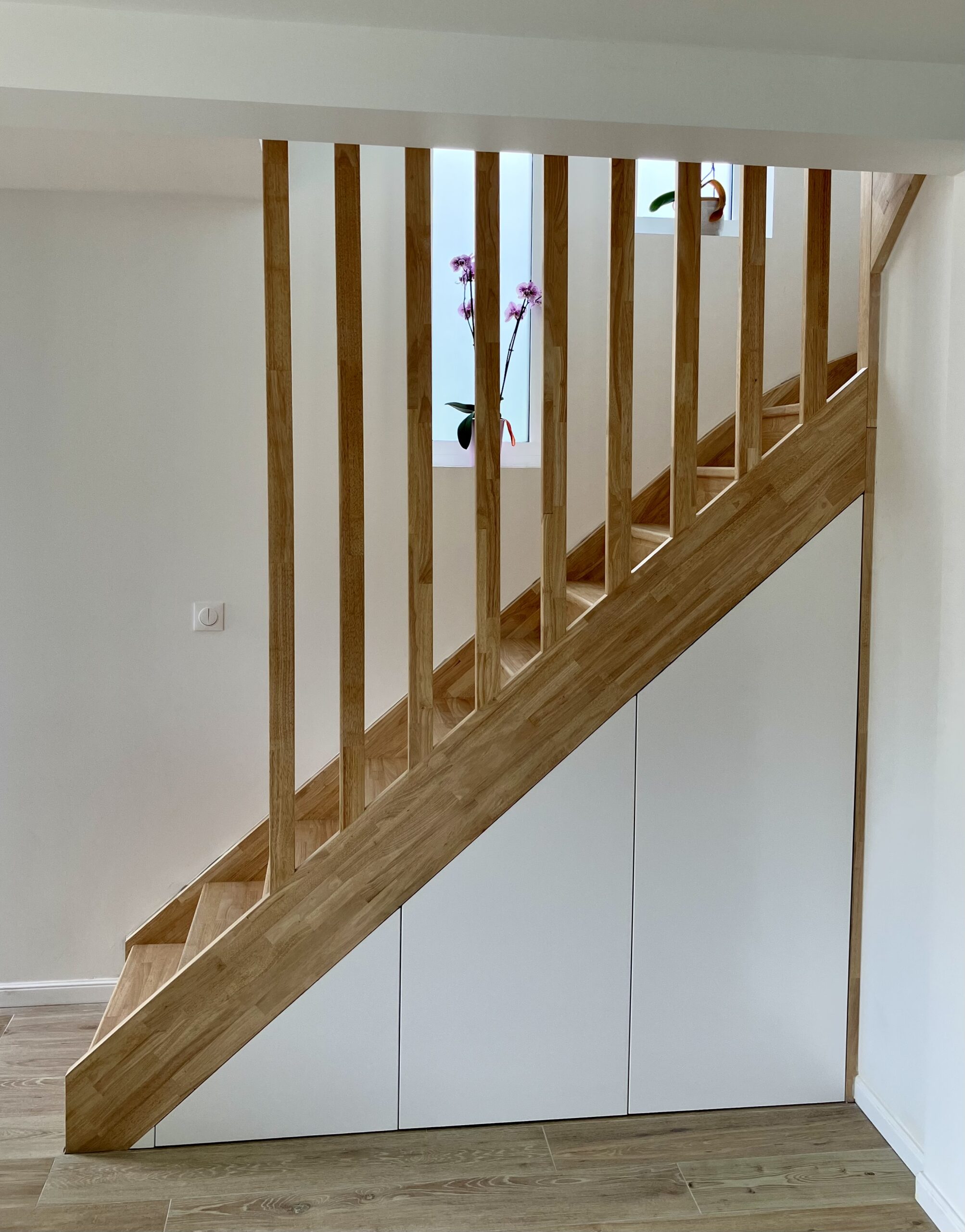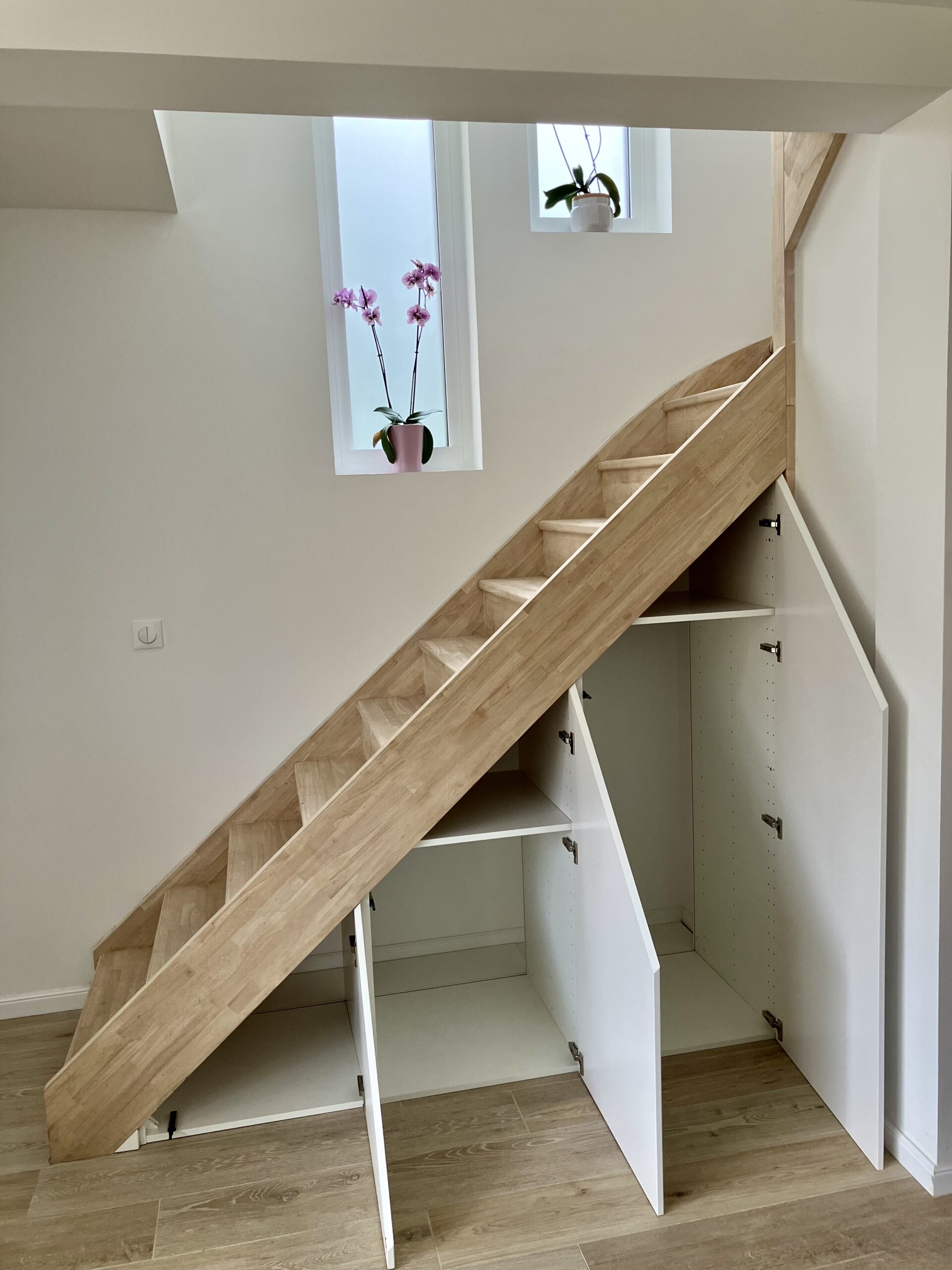 Dans ce projet, le souhait était d’aménager et rendre fonctionnel l’espace sous l’escalier en y intégrant une penderie et des rangements.