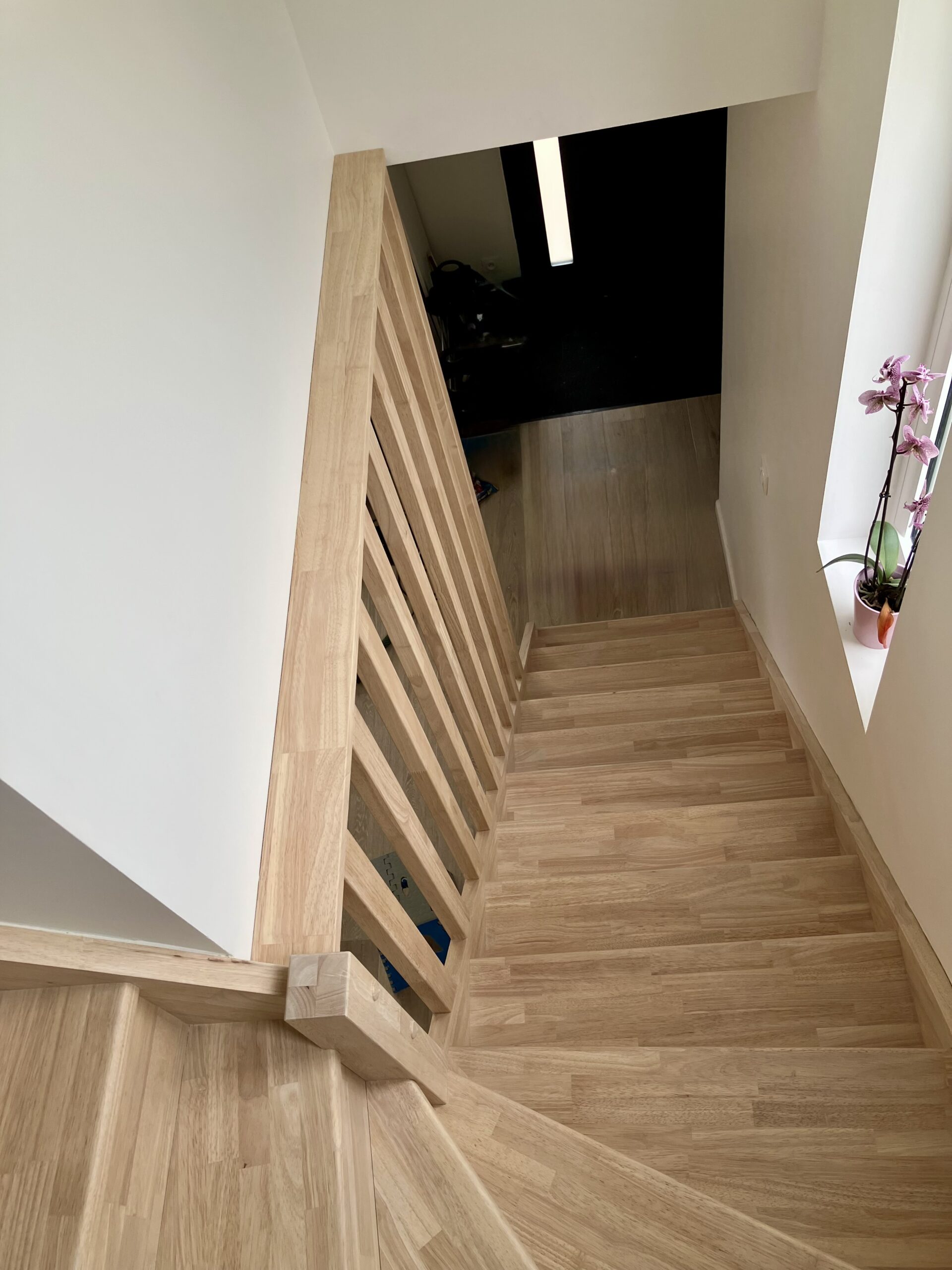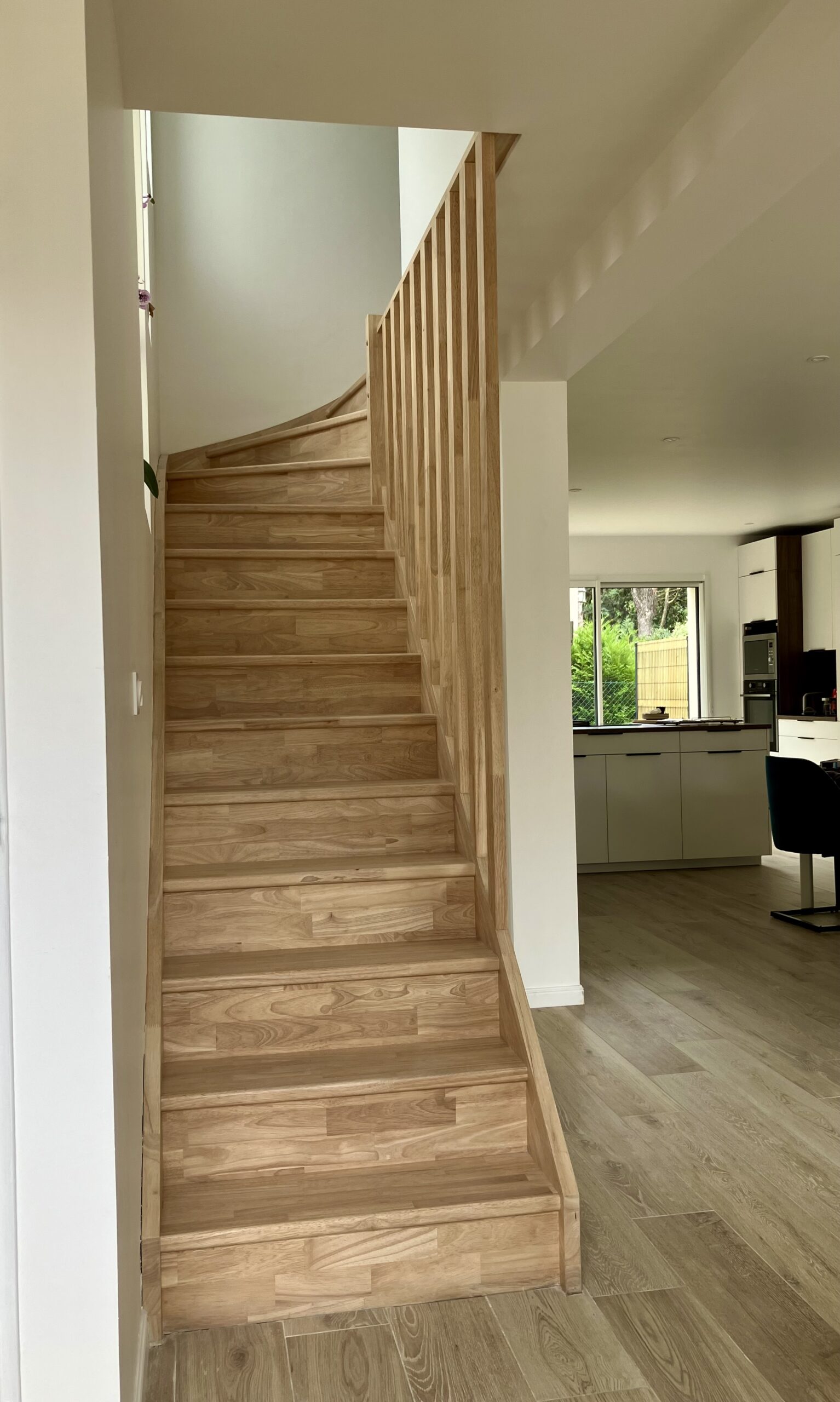 L’ensemble de l’escalier et des claustras a été poncé, suivis par l’application d’un vitrificateur mat incolore en 2 couches avec un égrenage entre les deux afin de conserver l’aspect « brut » et le protéger durablement.