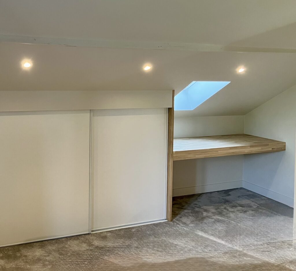 Les bureaux et joues de finition sont en chêne lamellé collé et ont été réalisés sur mesure afin de s’adapter à la sous pente.