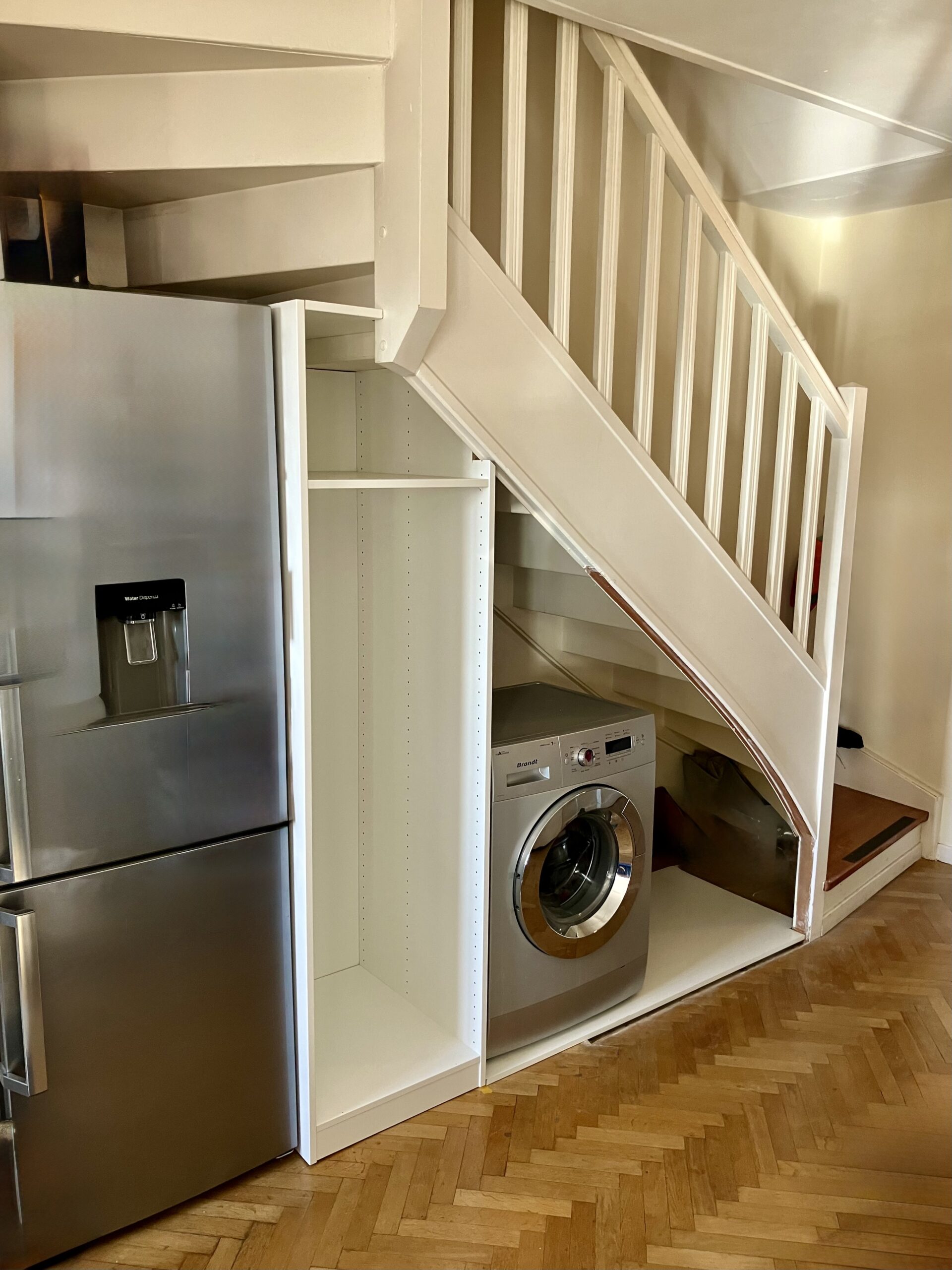 Pour ce projet d’agencement, le souhait était de repenser et réaménager totalement l’espace sous l’escalier afin de rendre fonctionnel cet espace mal exploité.